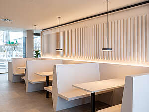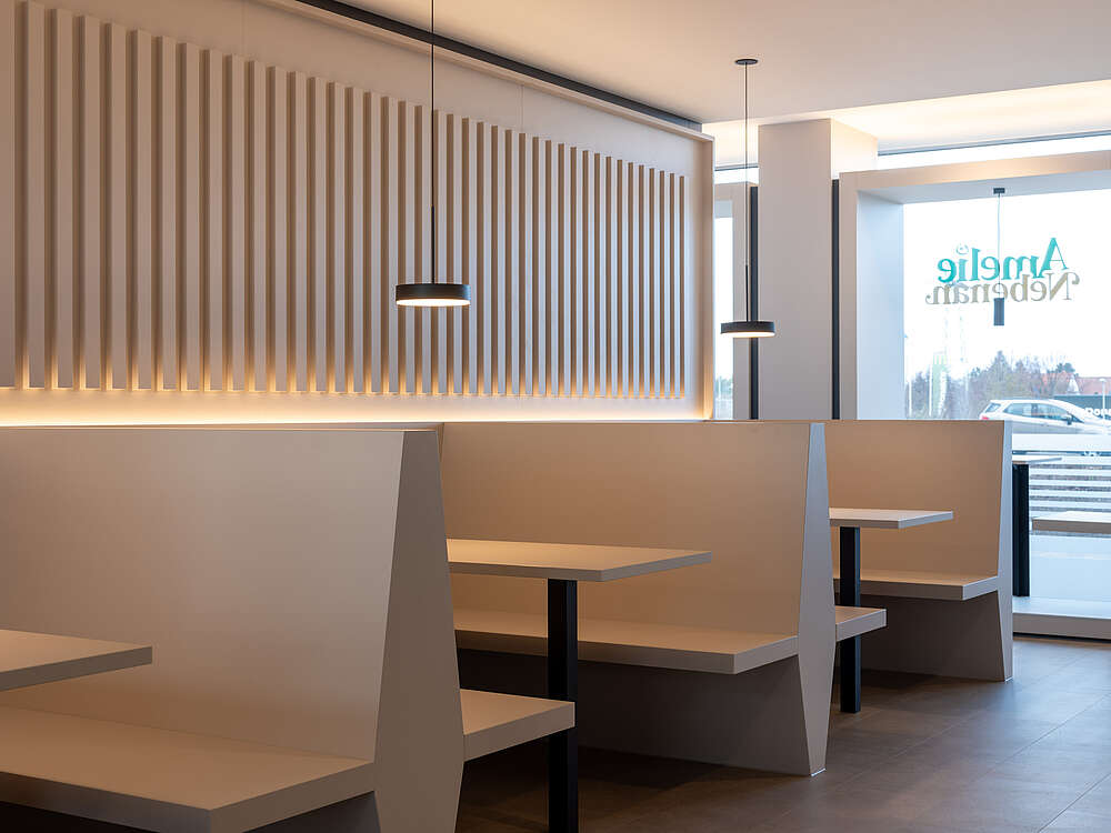 Das Architekturbüro Südseite Architektur hat den Innenausbau des Café und Bistro - Amelie Nebenan für die Lebenshilfe Erfurt geplant und umgesetzt. Das Konzept fügt sich harmonisch in das neu entstandene Gebiet am Europaplatz in Erfurt ein.