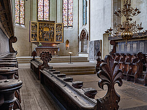 Das Chorgestühl in der Predigerkirche ist um 1280 gefertigt und in die damals noch nicht fertiggestellte Kirche eingebaut worden. Der vom Lettner abgetrennte Hohe Chor der dreischiffigen Basilika beherbergt dieses wahrscheinlich älteste noch existierende und zusammenhängende Chorgestühl Europas. Im übrigen, saß der Dominikaner Mönch, Prior und Mystiker Meister Eckart auch auf diesen Bänken.